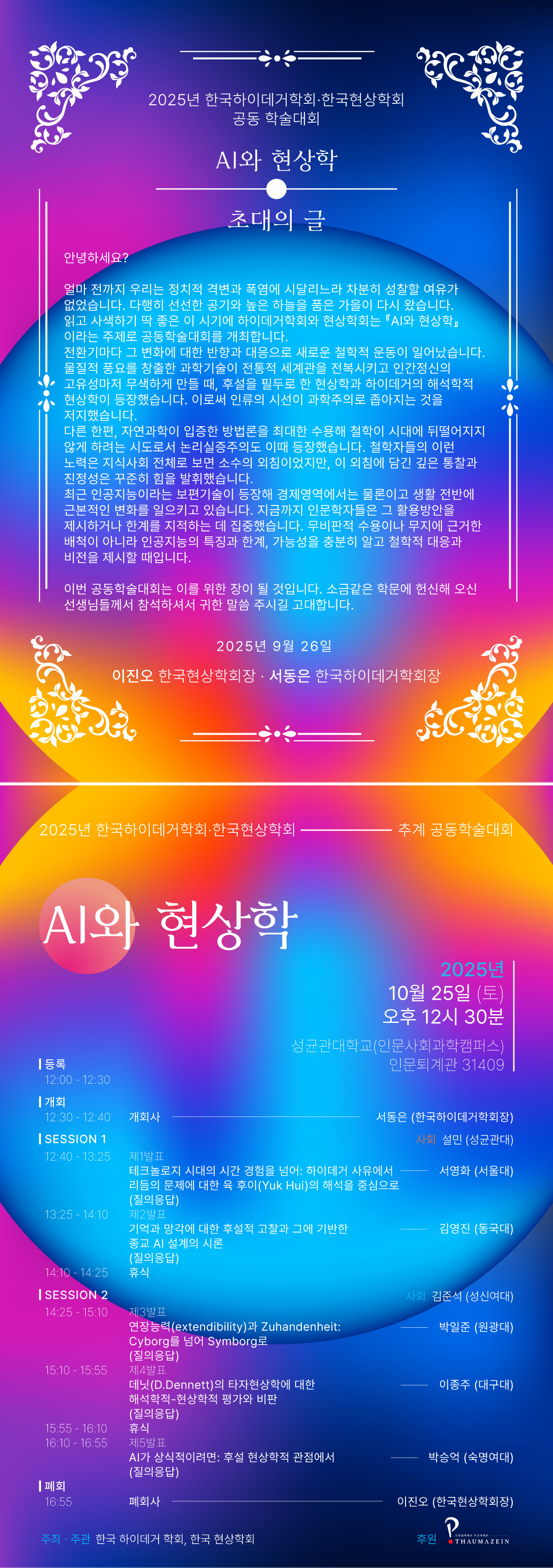10월 25일 (토) 성균관대학교(인문사회과학캠퍼스)에서 한국하이데거 학회와 공동으로 주최하는 2025년 추계 학술대회 소식을 알려드립니다.