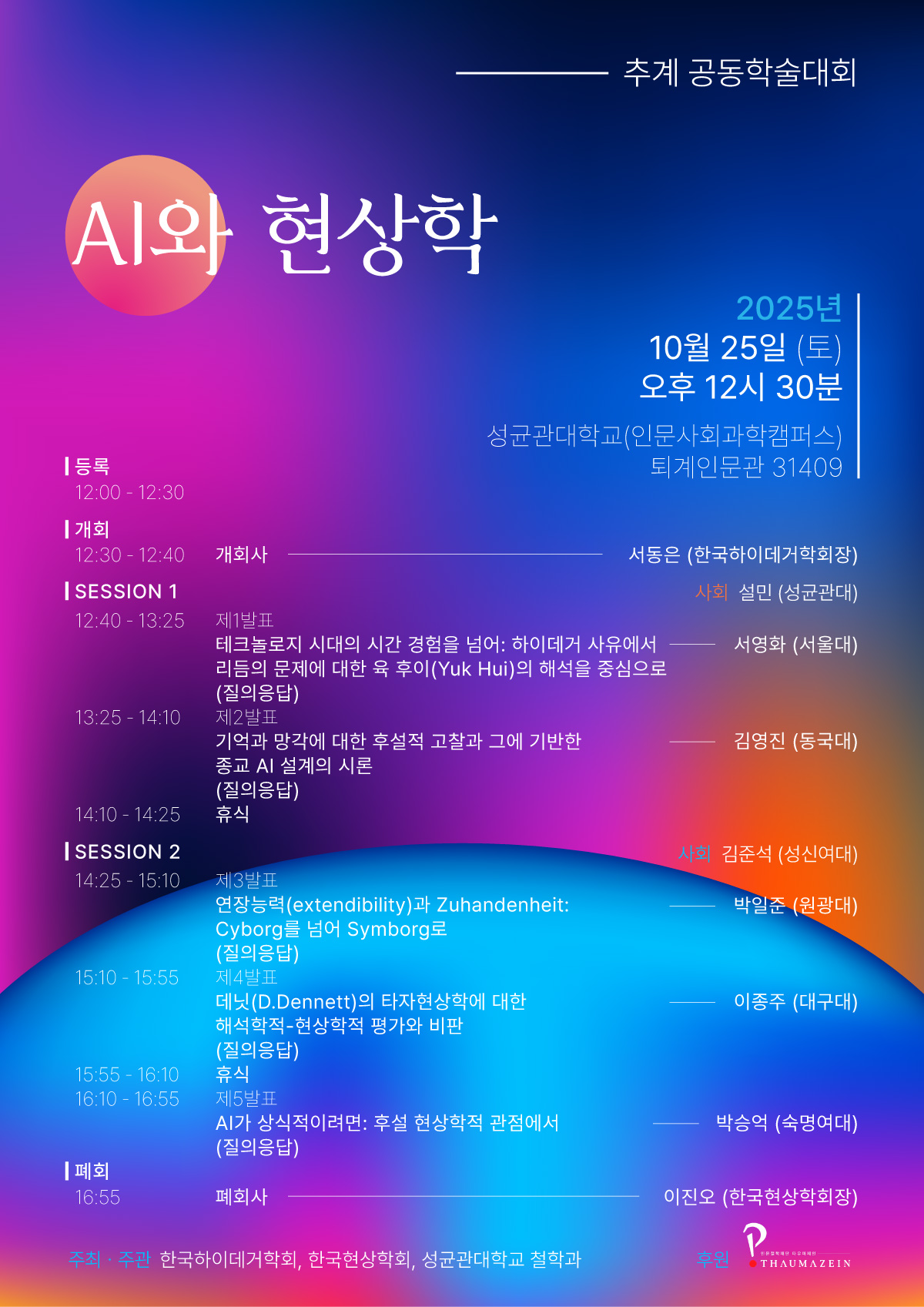 2025년 한국현상학회와 한국하이데거 학회가 공동 주최한 추계학술대회에 참석해 주신 발표자 및 모든 참가자 선생님들께 감사드립니다. 다음 정기 학술대회는 12월 19일 (금) 경희대학교에서 '현상학과 실존철학'을 주제로 열릴 예정입니다. 동계 학술대회에서 뵙겠습니다. 감사합니다.